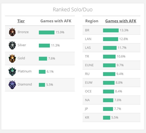 Az EUNE meccsek 9.7%-án, az EUW meccsek 8.8%-án fordul elő AFK.