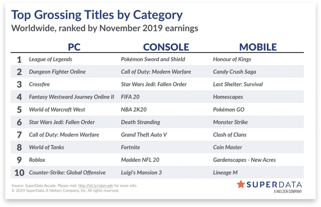 A PC-s lista élén persze még mindig a League of Legends szerepel, és továbbra is sikeres eladások tekintetében a Call of Duty: Modern Warfare is, ami különösen konzolon hódított.