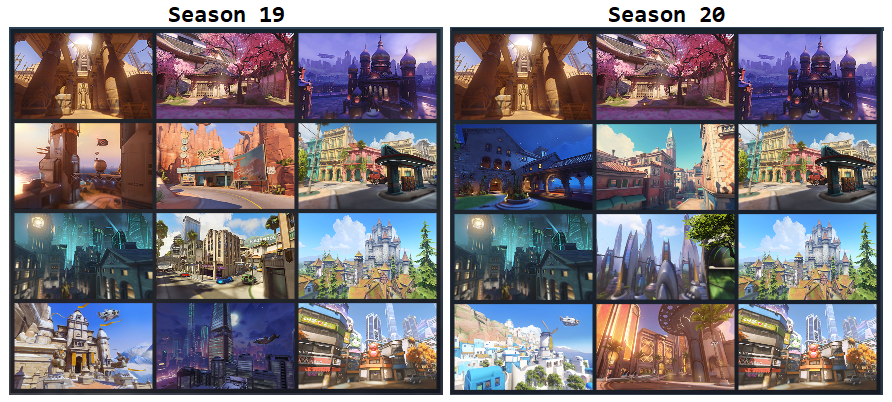 Amint az látszik is, az Assault mapok között nincs változás. Hanamura, Temple of Anubis és Volskaya Industries is kompetitív pályák maradtak. Hybrid mapok közül egyet cserélt a Blizzard, Hollywood heylett ezentúl Numbani lesz a Competitive Map Pool része.