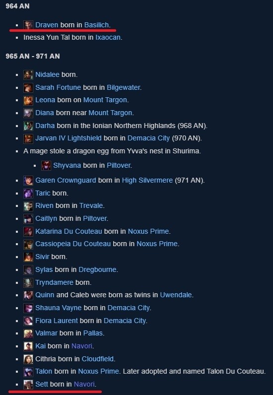 L J Goulding, a LoL hősök sztorijáért felelős igazgató konkrét számot nem tudott akkor még mondani, de mostanra ez is kiderült. Draven maximum 7 éves lehetett, amikor Sett megszületett Navoriban. De lehetett akár kettő is, a lényeg, hogy még bőven nem került „apa korba”. Ez már a hősök idővonalából derül ki, mely szerint Draven 964-ben született, Sett pedig a 965-től 971-ig terjedő időszakban.