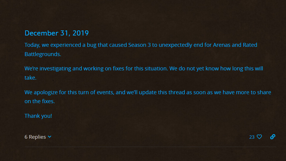 2019 végén meglepő gyorsasággal ért véget a jelenlegi harmadik PvP szezon. Ez az arénát és a rated battlegroundokat érintette és természetesen sok játékos fejezte ki nem tetszését a meglepő fordulattal kapcsolatban a WoW hivatalos fórumain. Kaiwax nyilatkozott végül a Blizzard oldaláról, miszerint egy programozási hiba áll a háttérben és már dolgoznak a helyrehozásán.