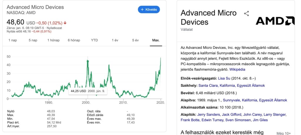 Ennek örömére az árfolyam is szépen megindult felfelé, hiszen egy éve januárban még 19 dollárért mentek az AMD részvények, ellenben 2020 január 3-án már 49,1 dollárt kértek egyetlen részvényért.