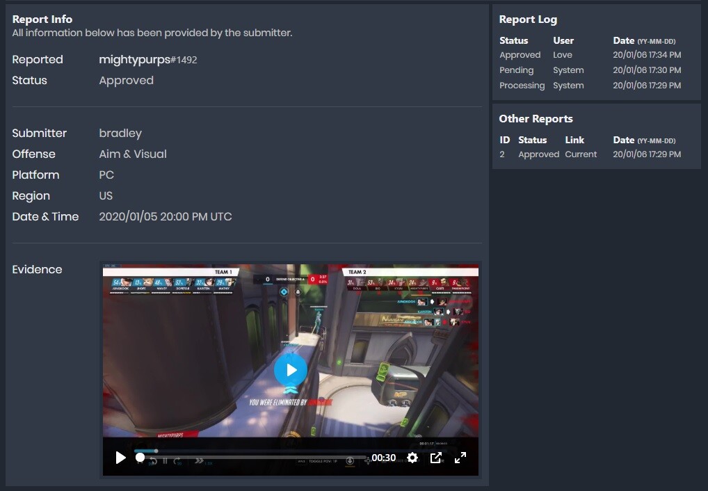A rendszer megmutatja a gyanús Overwatch játékosokat, és közvetlenül reportolhatjuk is őket az oldalon.
