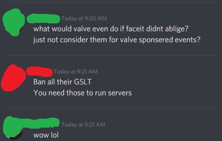 „Nem, kibannolják az összes GSLT-t (Game Server Login Token), amikről a FACEIT szerverek futnak. És akkor leáll az egész FACEIT, ezek nélkül nem megy.”
