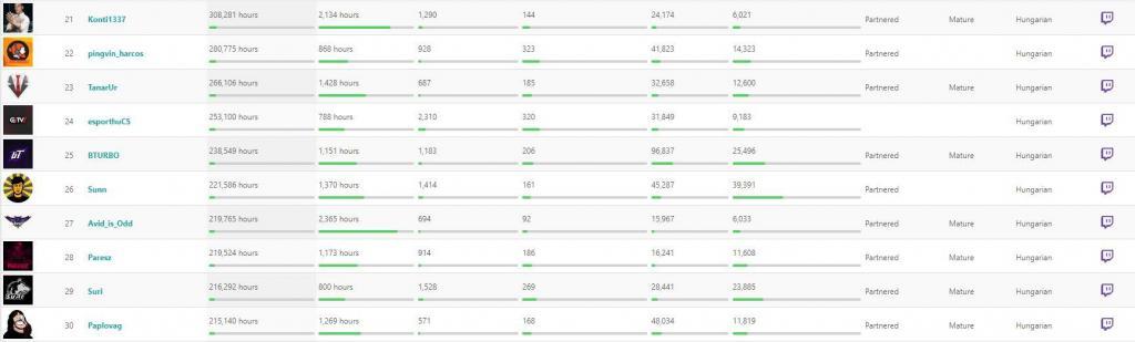 A 22. helyen pingvin_harcos áll, akinek a csatornáján 280 ezer órát töltöttek el a nézők. Pedig mindössze 868 órát streamelt, amit átlagosan 323 néző követett végig figyelemmel. Őt követi Magyarország egykori legnagyobb tradere, Tanár Úr, aki karrierjét CS:GO tradeléssel kezdte, de 2019-ben az ideje java részét PUBG-vel töltötte. A csatornáján 266 ezer órát töltöttek el, amihez 1438 óra közvetítés párosult.