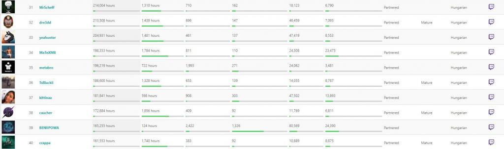 A 38. helyen ismét egy vérbeli variety streamer áll, caucher személyében, akinek noha a PUBG volt a kedvenc játéka, emellett számtalan másik címet pörgetett ki az év során. Őt követi a YouTube-on is nagy ismertségnek örvendő BENIIPOWA, aki 2019-ben sem vitte túlzásba a streamelést, hiszen mintegy 124 órát töltött élő közvetítéssel. Ezeket viszont átlagosan 1326 néző követte, 24 390 új követővel gazdagodott és 165 ezer órát töltöttek el a csatornáján. Ő biztosan bekerülhetne a legnépszerűbb streamerek közé, ha kicsit több időt töltene a platformon.