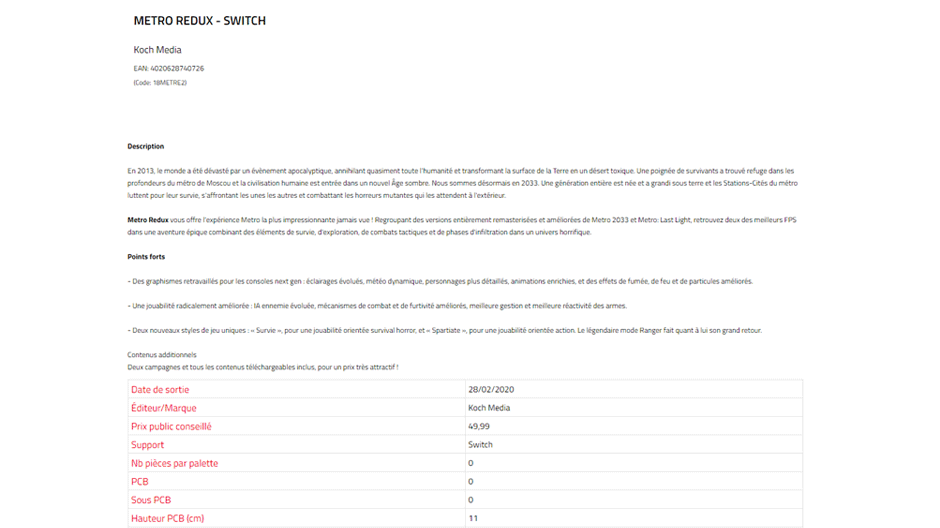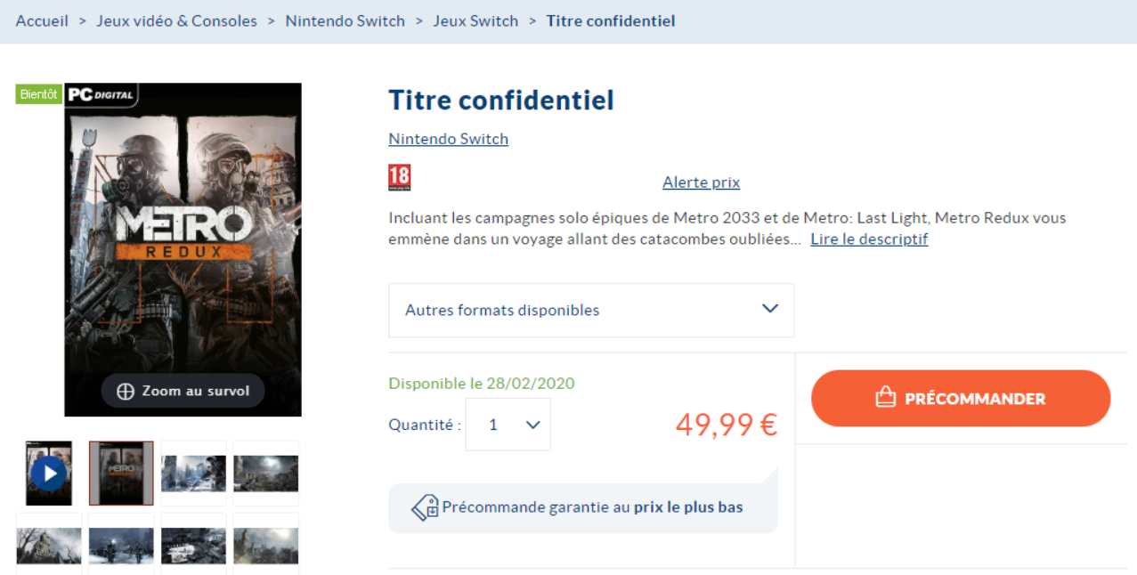 Gyorsan rákerestünk a megadott EAN számra és kiderült, hogy egy „titkosított címhez” tartozik, bár a rendszer hibás működése miatt pár Metro Redux kép is előkerült. Az oldal egy PC-s verziónak a képét mutatta, de a listázás szerint a Nintendo Switch játékok közé sorolandó a kód tulajdonosa.