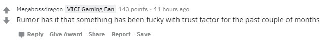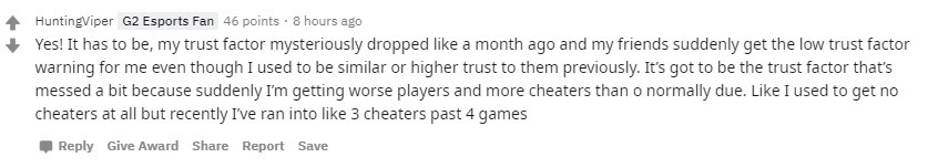 „Egy hónapja a Trust Factor pontszámom rejtélyesen megzuhant. A haverjaim elkezdtek figyelmeztetéseket kapni, hogy alacsony a Trust Factorom, pedig előtte való napon még ugyanolyan szinten voltunk mindannyian.”