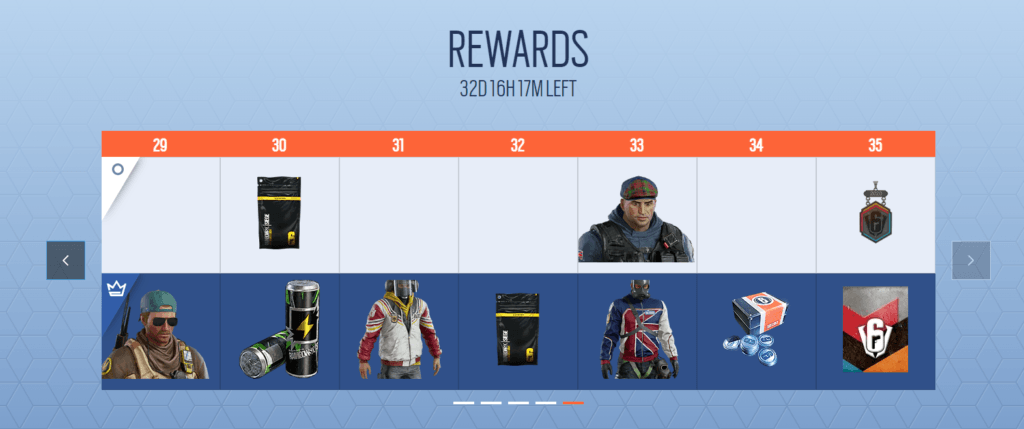 A Rainbow Six Road to S.I. Battle Pass három módon érhető el: vannak ingyenes alapszintek (35), 1200 R6 kreditért további 35 szint érhető el több jutalommal, illetve 2400 kreditért gyorsabban lehet szintet lépni.