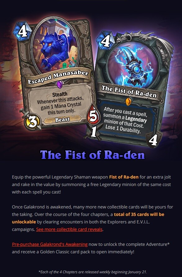 Spanyol forrásra hivatkozva nyolc új lapot tett közzé egy japán Hearthstone oldal, melyek eredetiségét senki nem tudta eldönteni. Egy hivatalos Blizzard email azonban mindent felülírt, megmutatták ugyanis a negyedik Legendary kártyát az új Solo Adventure lapkészletéből.