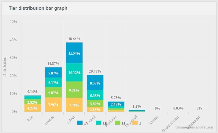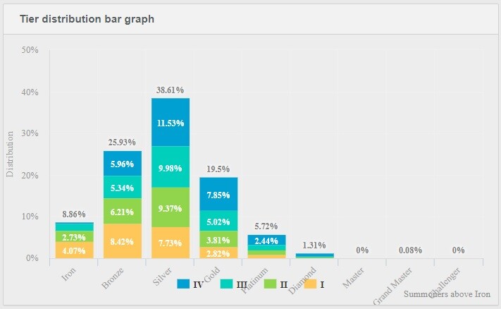 Jól látható, hogy mindkét szerveren a játékosok több mint kétharmada esett be Iron, Bronze és Silver rangokba. Egészen pontosan az EUNE játékosok 72.67%-a van Gold alatt, EUW-n ugyanez a szám 73.4%