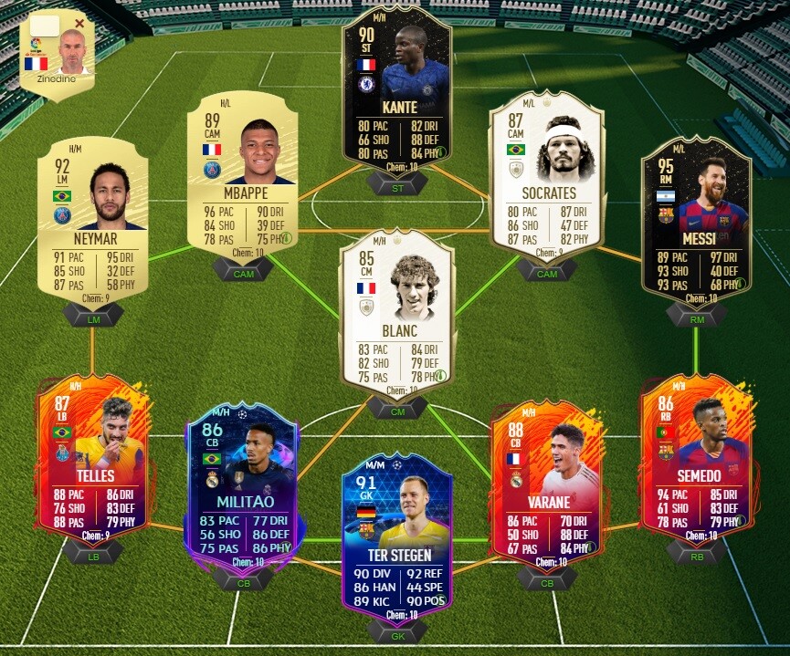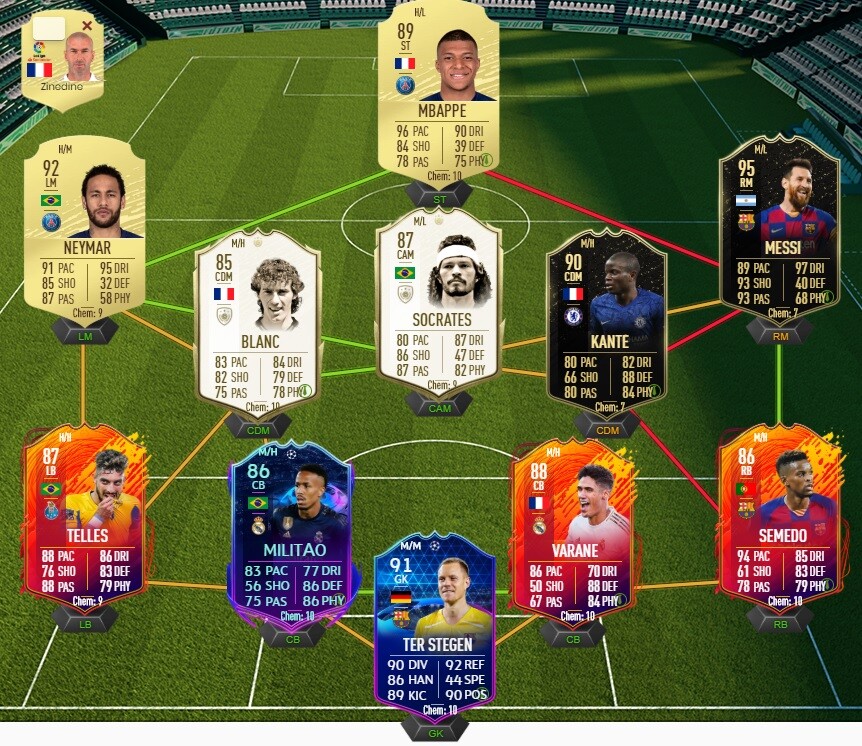 Szegény ember Roberto Carlos-a, azaz Alex Telles a bal oldali bekk. Megnézve a statisztikáit, nagyon szimpatikus adatokat kapunk. Az egyetlen egy negatívuma a 2-es WF, de máskülönben szépen elmuzsikál bal oldalt Jobbra, a profi meta meghatározó lapját, Semedót választottuk, aki a LaLiga jelenlegi legjobb szélsője ezzel a kártyával. Ezenfelül strong linket ad Messihez, ami nem egy hátrány!