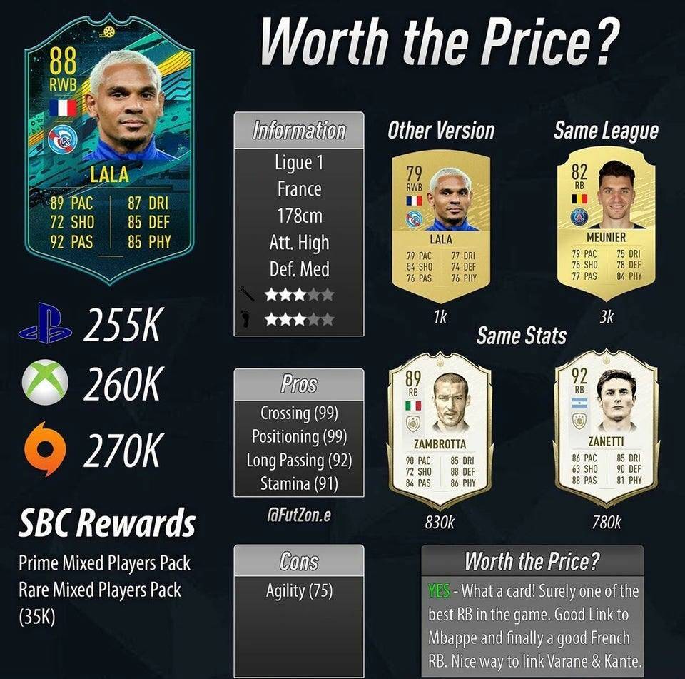 Kenny Lala 88-as lapja jelenleg kb 270 ezer zsetonból kihozható. Megszerzéséhez ugyanis egy 85-ös (ebbe kell egy TOTW is) és egy 86-os csapatot kell összerakni.