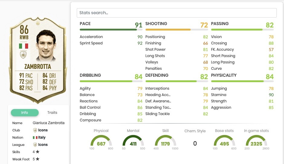 Zambrotta legkisebb ICON lapja szintén H/M WR-rel rendelkezik. 4-es Skill moves mellé, 5-ös Weak Foot párosul, mely jobb, mint Lala 3 csillagos statjai. Pace-ben is gyorsabb az olasz, valamint 3 centivel magasabb is. Base Chemistry esetén Pace-ben erősebb, valamint Agility, Composure és Heading Accuracy statokban veri meg a franciát. De ennyi, sok minden másban viszont már nemigen veri meg Lala Moments lapját.