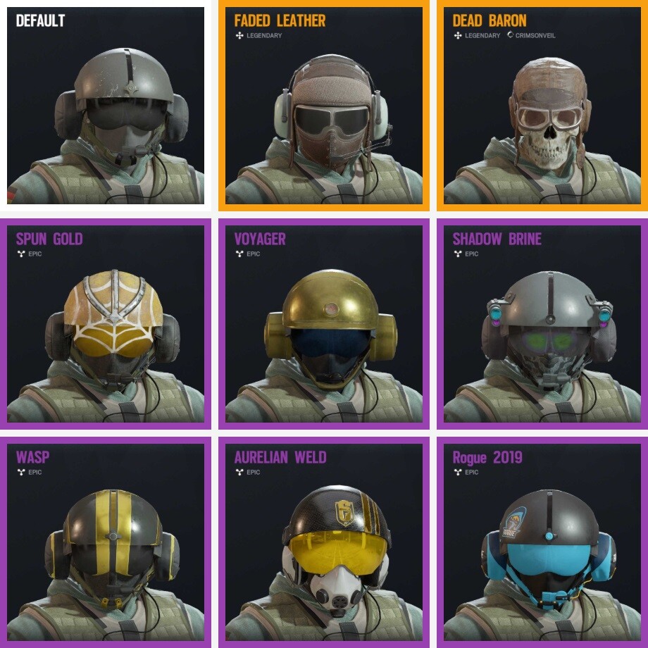 Search, sort, and browse the Rainbow Six Siege catalog of 🧢Headgears , 👕Uniforms, 💎Skins, and 🧸Charms from past and present.