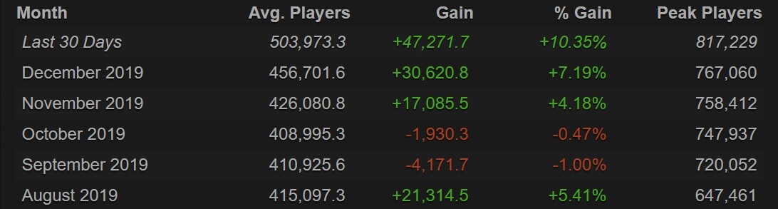 Az elmúlt 30 nap eredményei már most 503 ezer embert mutatnak, az egyidejű legnagyobb szám pedig 817 229-en állt meg a januárban. Ez a CS:GO történetében mért 4. legnagyobb szám, a játék fennállása óta.