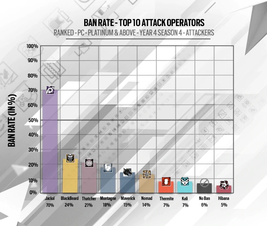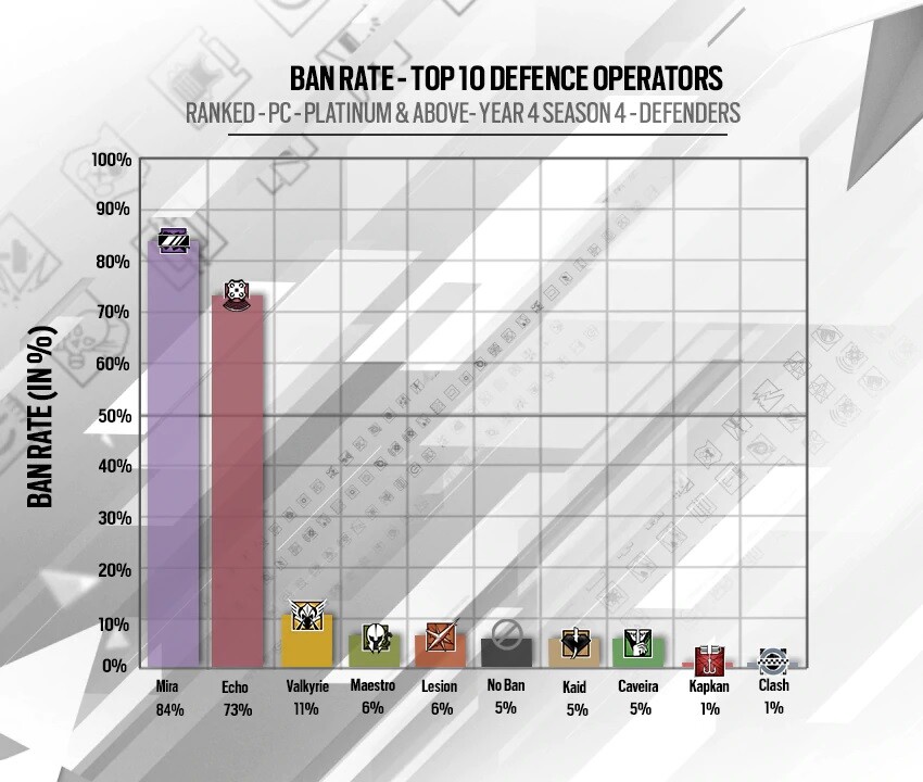 A másik érdekes grafikon a bannolt operátorok aránya. Mint látható, annak ellenére, hogy Jackal jelentős változásokon ment keresztül, még mindig óriási arányban bannolják a ranked és unranked meccsekből. Védő oldalon Mira és Echo szenvedi el a legtöbb bant. Clash valószínűleg csak azért 1% most, mert az elmúlt hónapokban (joggal) hiányzott a játékból.