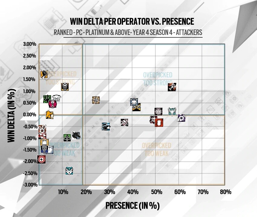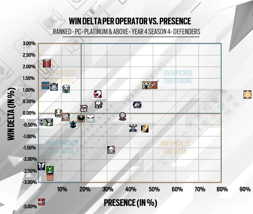 A Win Delta az átlagos nyerési arány, amikor egy operátort kiválasztanak, a mínusz érték pedig az, amikor az operátort nem választják. Pontosabban ez azt jelenti, hogy szezononként kiszámolják, hogy a meccsek során mekkora arányban vannak győztes meccsek, ha az adott operátor jelen van a meccsben, illetve mekkora akkor, amikor az operátor nincs jelen. Mínusz az érték, ha a csapatok átlagosan többet nyernek az operátor nélkül, illetve pozitív, ha a csapatok átlagosan többet nyernek, ha az operátor benne van a csapatban. A Presence érték annak az aránya, hogy az operátor milyen mértékben választják, amennyiben nincs bannolva.