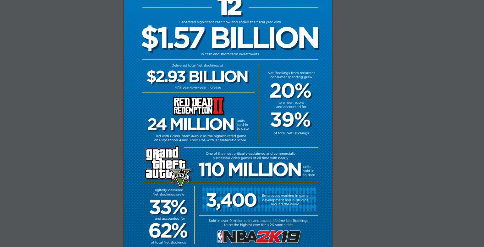 „Csaknem hat évvel a megjelenés után a Grand Theft Auto V és a Grand Theft Auto Online továbbra is jelentős eredményeket mutat. A GTA V csaknem 110 millió példányban fogyott, és megerősítette helyzetét, mint a jelenlegi konzolgeneráció „kötelező” címe. A Rockstar Games játékai továbbra is rendkívüli magas eredményeket mutatnak” – olvasható a leírásban.