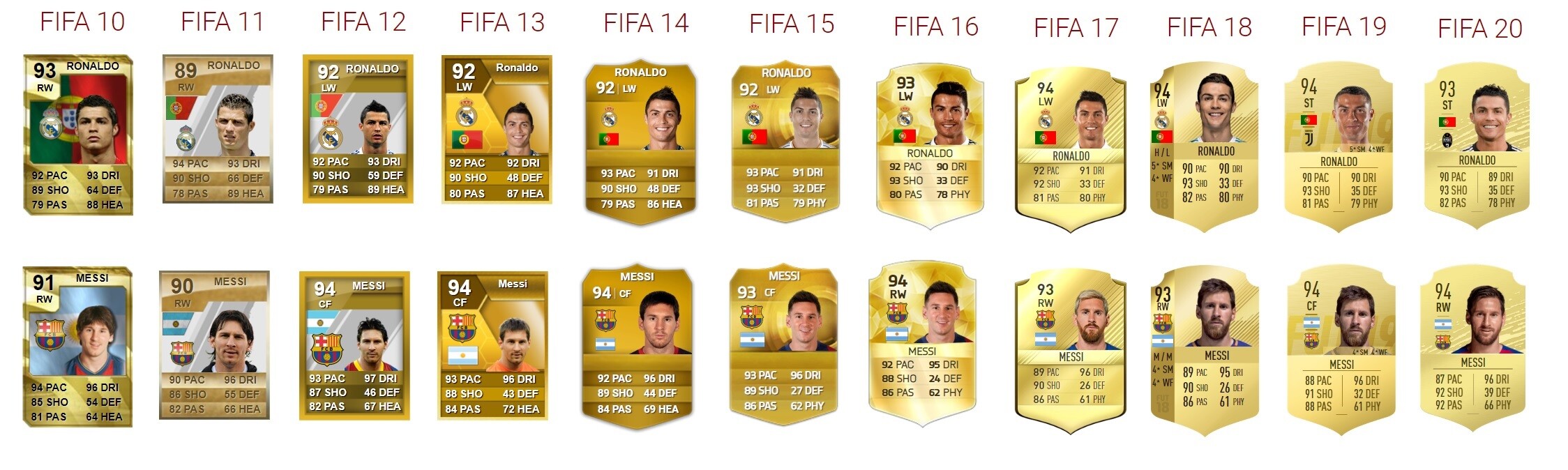 A FIFA 10-ben Ronaldónak volt erősebb lapja, ebben az évben igazolt a portugál Real Madridhoz. Összeértékelése 93-as volt, míg argentin riválisa 91-es lappal büszkélkedhetett. Az első két szériában még ugyanazon a poszton játszottak, mind a ketten RW lapot kaptak. Messi a FIFA 12-ben érte el a csúcsot, ekkor kapta meg először a 94-es értékelését. Érdekes módon ebben az évben még nem ő volt a játék borítójának arca. Ezt a kitüntetést csak a FIFA 13-tól viselhette Messi egészen a FIFA 16-ig. Az elmúlt 11 játék alatt az argentin hatszor kapta meg a 94-es értéket, ezzel szemben Ronaldo csak háromszor érdemelte ki azt.