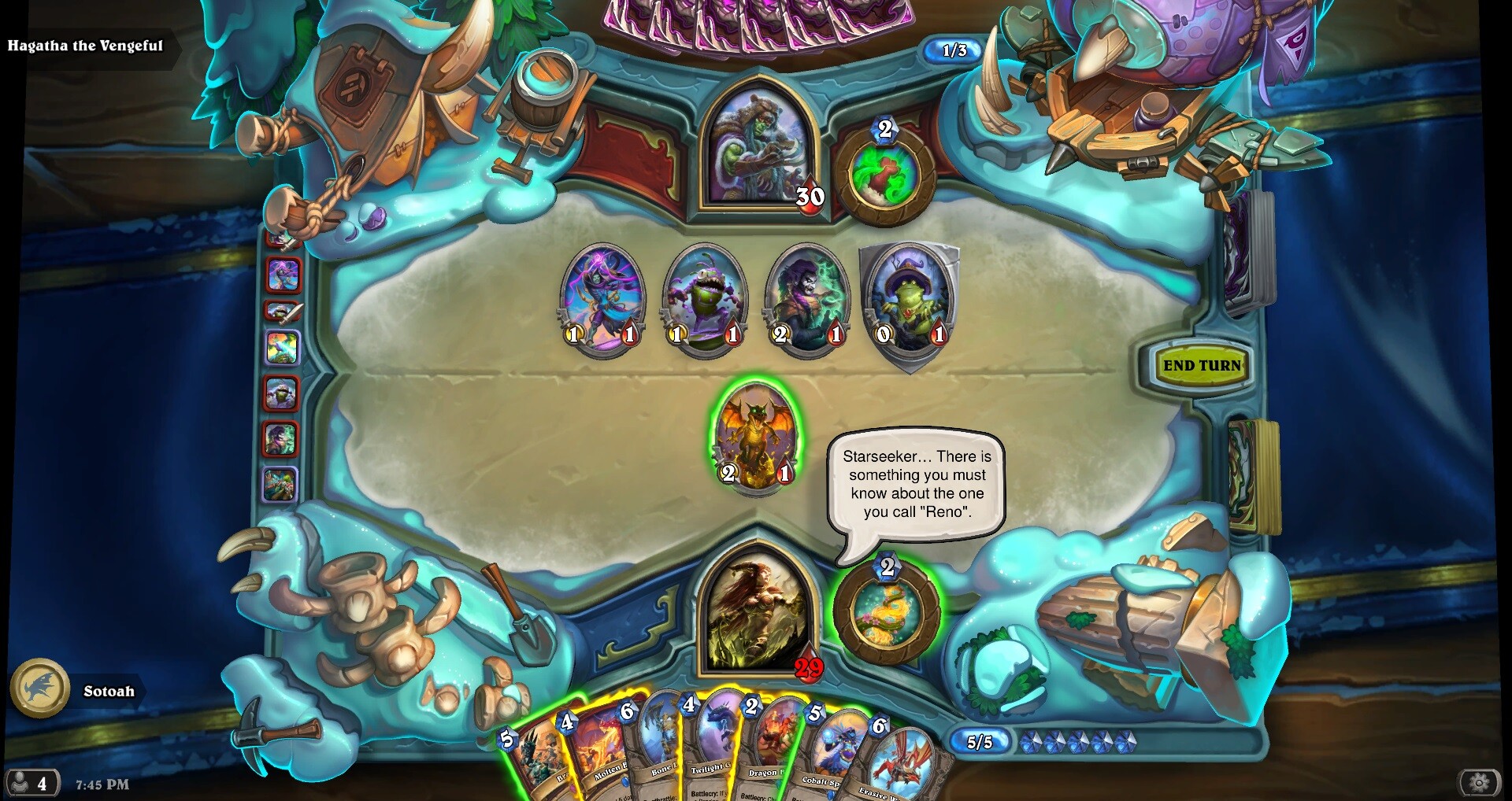 Az új lapokon kívül persze az extra információkra is odafigyelt a Blizzard. Ismét hagyott egy aprócska nyomot, amiben a Reno Jackson fanok kapaszkodhatnak. Szárnyra kélt ugyanis egy elmélet, miszerint Reno hamarosan sárkánnyá változva jelenik majd meg. A mostani szárnyban elhangzó idézet pedig csak tovább erősíti ezt.