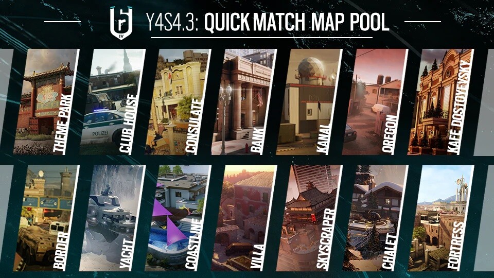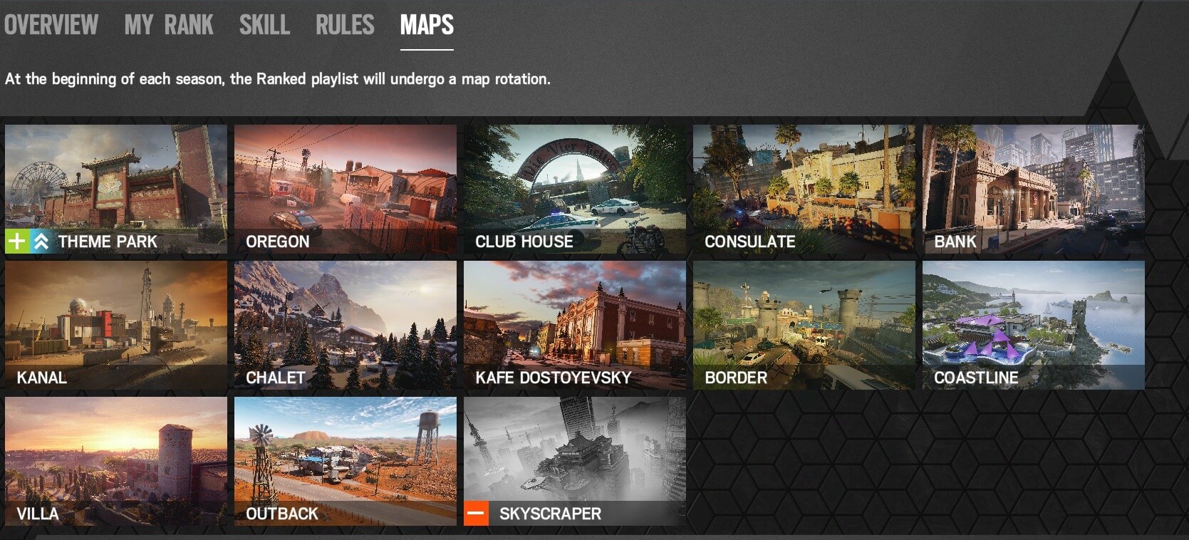 Ami változás, hogy Tower kikerül a listából, helyette bekerül Oregon. Favela helyett mostantól ismét játszható lesz Chalet, a Outback helyett pedig visszatér Fortress. A Rainbow Six Siege-ben Unranked és Ranked játékmódokban egyébként az alábbi mapok érhetők el (kivéve Skyscraper).
