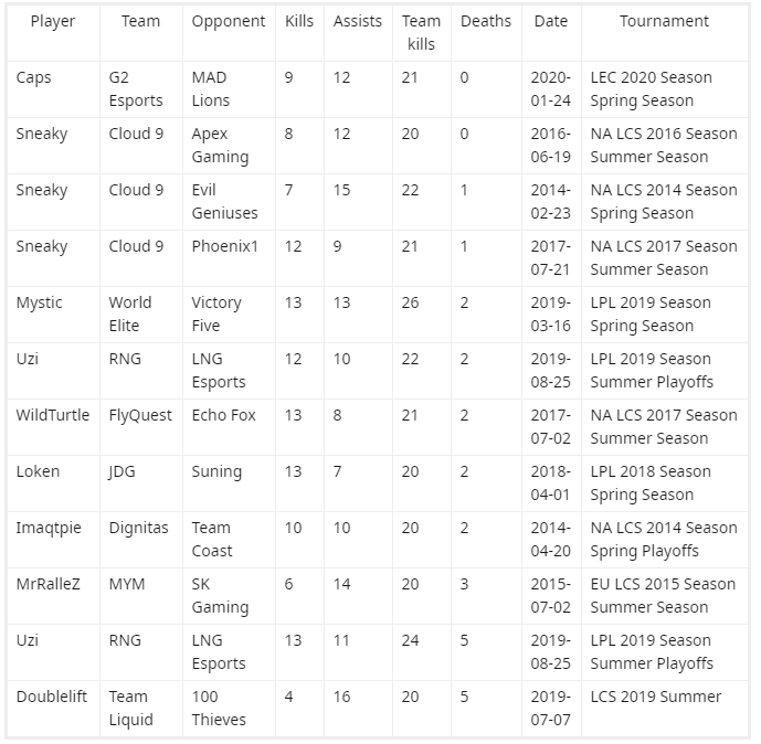 Legközelebb a Cloud9 visszavonult lövésze, Sneaky állt ehhez, aki egy meccsen 100%-os Kill participationt hozott össze halál nélkül, ő viszont „csak” 20-ig jutott. A dán tehát első mérkőzésével rögtön egy rekordot is felállított új szerepkörében. Kíváncsian várjuk, hogy idén mire lesz képes Caps. A már említett listát itt találjátok: