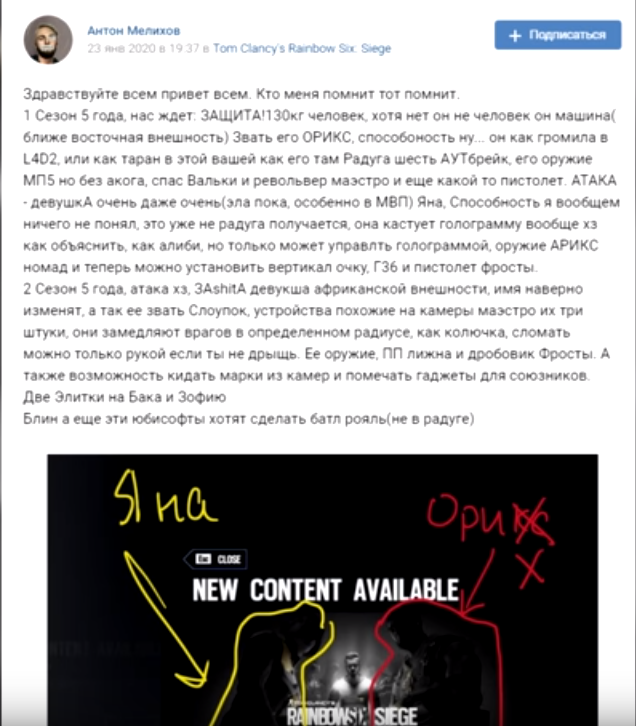 A Redditen tegnap jelent meg egy érdekes bejegyzés, miszerint egy megbízható Facebook felhasználó, aki korábban Kali CSRX300-as puskáját és Wamai eszközét is jó előre kiszivárogtatta az R6 közösségben. Most új infókat tett közzé az ötödik évad új operátorairól. Az eredeti oroszt orosz nyelven jelent meg, melyet valaki volt szíves lefordítani.