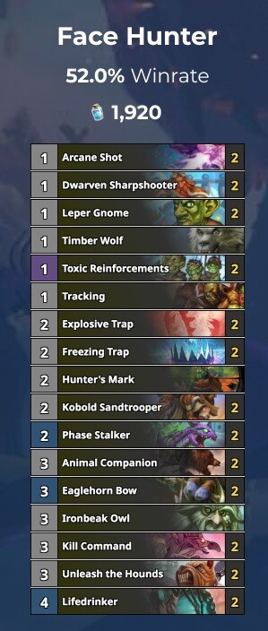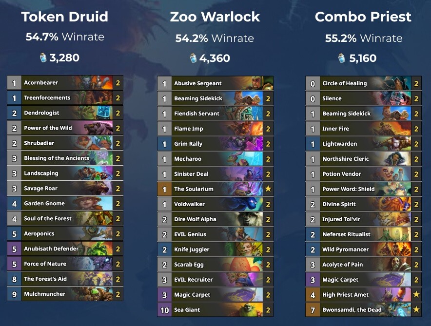 Pont ezen szempontok miatt a Face paklik és a Zoo deckek szokták ilyenkor dominálni a mezőnyt. A HSReplay ebben a hónapban is segít a gyors mászást választóknak egy kis háttérinfóval, megmutatták a legolcsóbb, mégis eredményes paklit a metából.