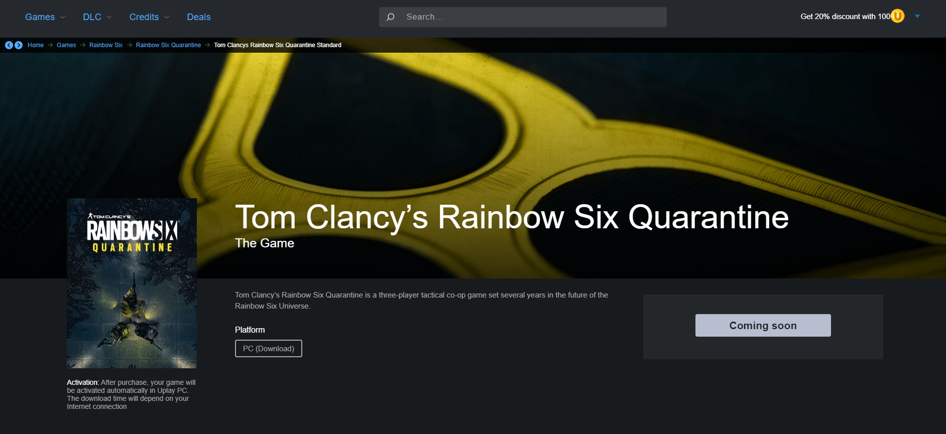 A Rainow Six Quarantine valószínűleg szintén azon játékok közé tartozik majd, mely a Uplay-en kívül talán csak az Epic Games Store-ban lesz majd kapható. Sajnos egyelőre pontos megjelenési dátum nincs, az adatlapon csupán a korábban is bemutatott előzetes látható. Persze a fejlesztők egy rövid videóban már beszéltek a játékról.