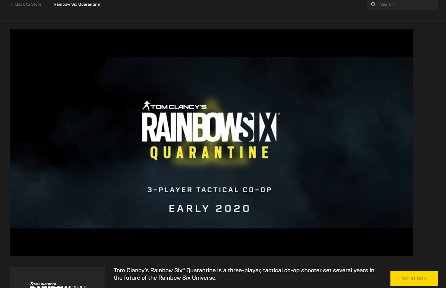 Még tavaly október végén jött a hír, hogy az E3-on bejelentett Rainbow Six Quarantine megjelenése csúszik. Így valamikor a 2020-21-es pénzügyi évben jelenhet meg, aminek kezdete idén áprilisban van. A játék adatlapja közben megjelent az Epic Games Store oldalán is, ahol valószínűleg hamarosan előrendelhetővé válik. Exkluzivitásra nem igazán számítunk, hiszen a Uplay-ben is megvásárolható lesz, ám egyelőre arról nincs hír, hogy a Steamen is megjelenne.