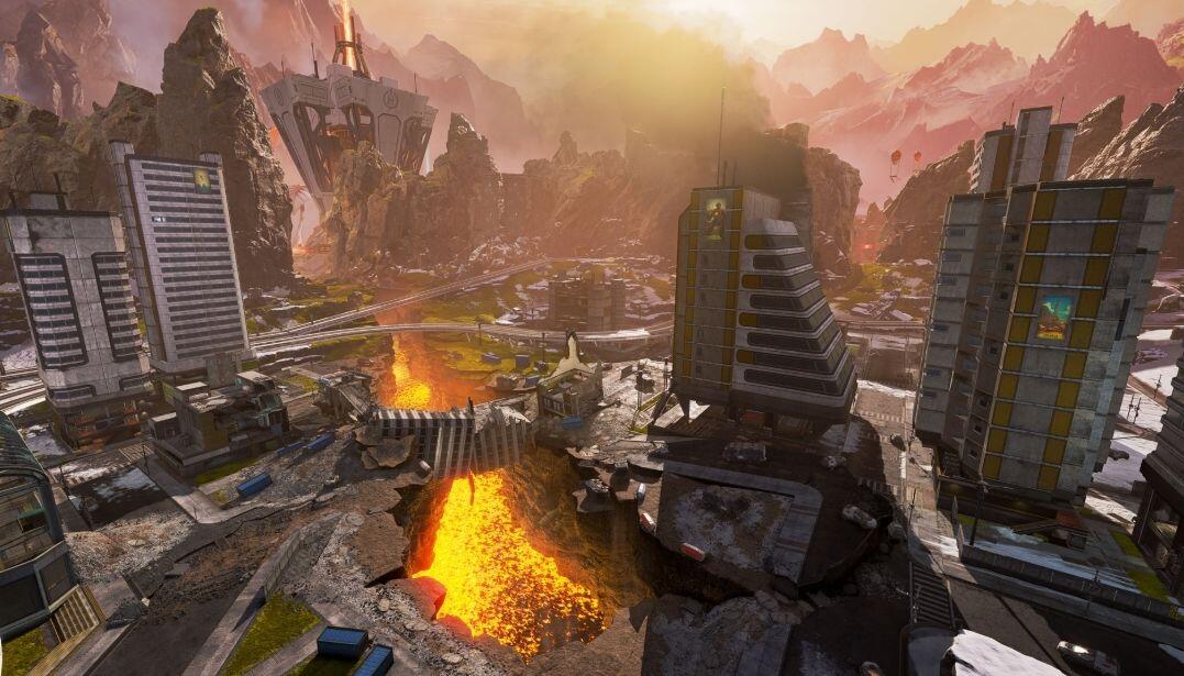 Ahogy a képen is látható, a város közepén egy óriási szakadék tátong, lent hömpölygő lávával, szóval nem lesz könnyű átjutni egyik oldalról a másikra. Szükség lesz bizony Pathfinder vagy Octane ultijára, hacsak nem kívánunk az egyetlen romon átkelni. Ott nyilvánvalóan könnyű célpontok lehetünk.