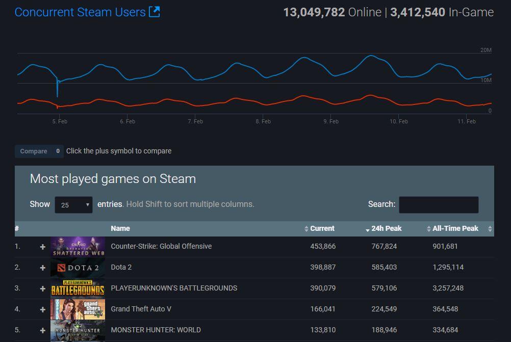 Steam: 19,107,803 (6,079,346 ingame – 32%)