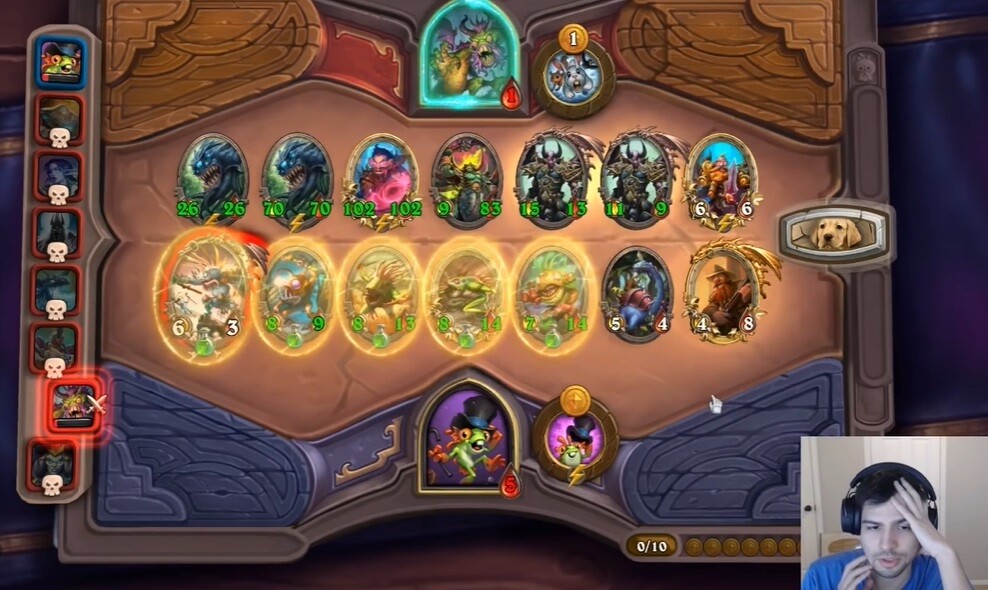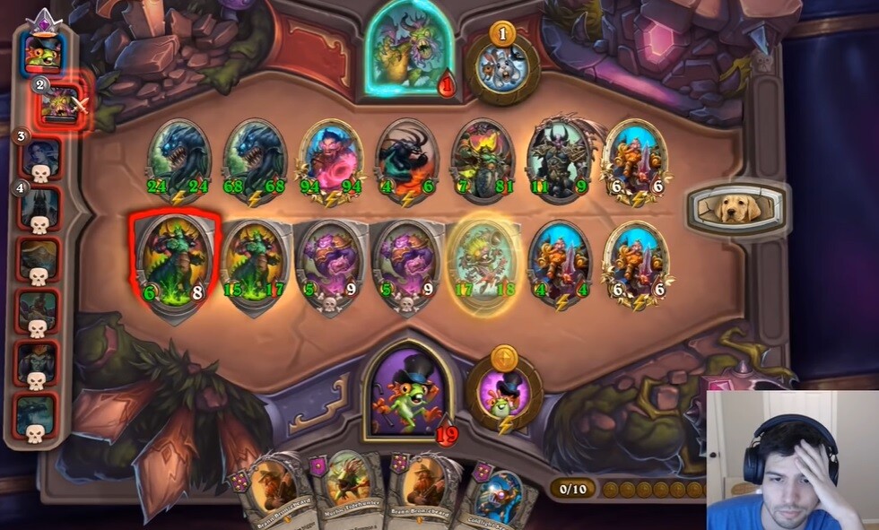 Innen indult a koncepció, dog azonban pontosan tudta, hogy ennyi HP ellen nincs elég sebzése. Tudatosan is készült erre az eshetőségre, ott van a kezében két Brann is. Innentől egyszerű a képlet: kell egy harmadik Brann, és a Tidehunter tokenjeivel együtt rögtön kap 2 Triple Reward kártyát is. Az egyikből szerezni kell egy Megasaurt, és jó képességeket kell kapni rá. Divine Shieldet és Poisonous-t mindenképp.