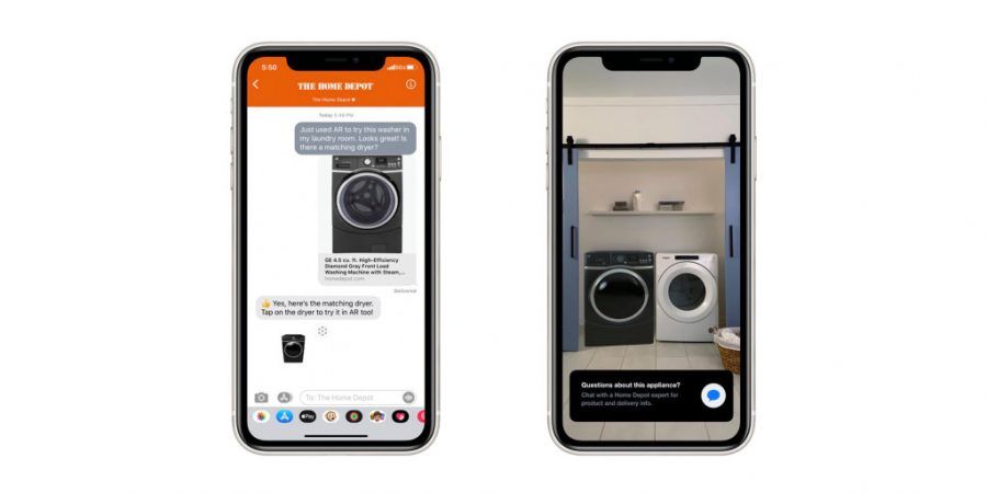 A boltok számára ugyanis mostantól lehetséges lesz egy egyszerű gomb hozzáadása a termék leíráshoz és a kamera segítségével már láthatjuk is a tárgyat valódi méretében, színében sőt még esetleges hangjával is. Ahogy a képen is látjátok, ha egy új mosógépet vennétek, de nem tudjátok elfér-e majd a fürdőben, ezzel könnyen letesztelhetitek még vásárlás előtt. Ezt pedig egy gombnyomással meg is vásárolhatjuk az Apple Pay-en keresztül.