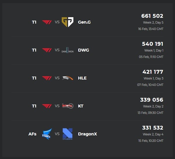 Érdemes egyébként megfigyelni, hogy eddig a T1 minden meccse bekerül a listába. A cikk megírásának pillanatában nyomják ötödik meccsüket, az eddigi négy pedig ott ül a nézettségi lista csúcsán. Simán lehet, hogy ha a DragonX elleni meccs után már minden Top5-ös meccs hozzájuk kötődik majd.