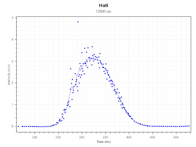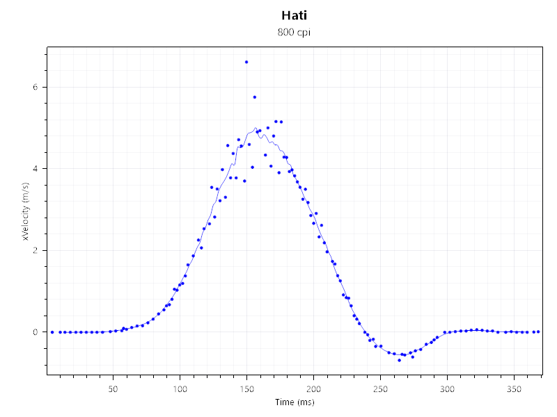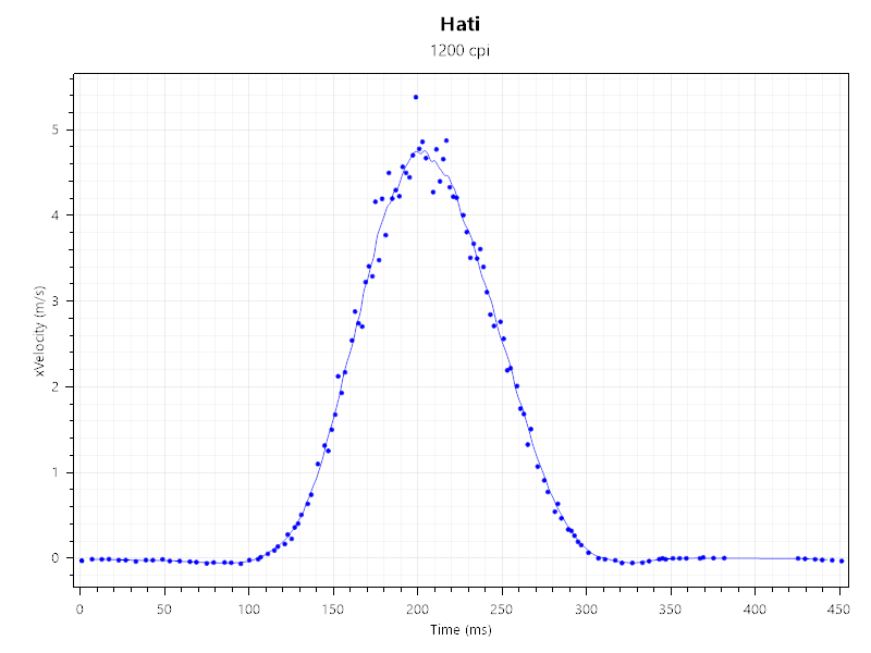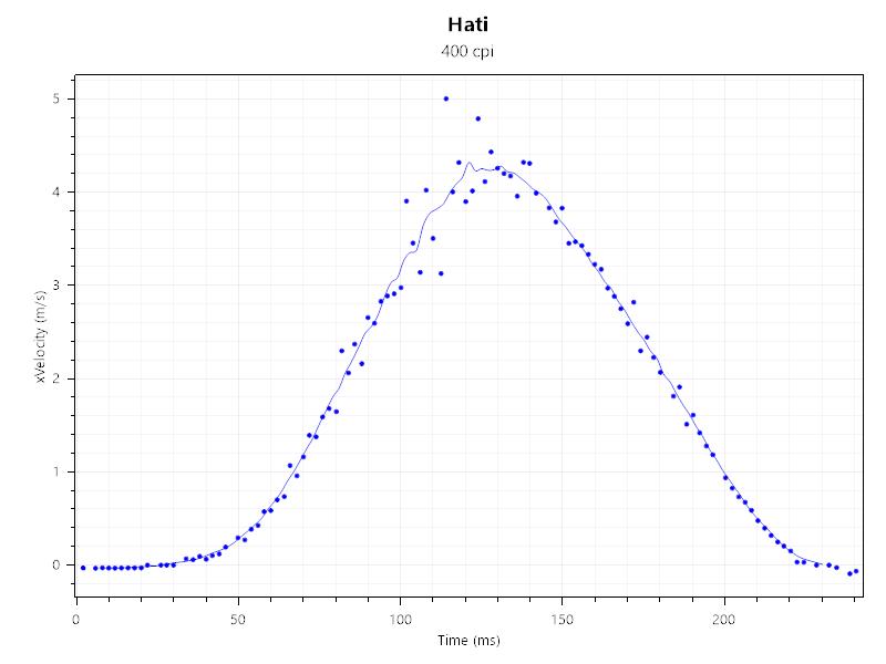 A mérésekhez a MouseTester v1.5-öt hívtam segítségül. Ezúttal 400-800-1200 és a maximális 12 000 DPI-on teszteltem az egeret. Nos, a Hati egyetlen esetben sem okozott csalódást. A fentebbi grafikonokon jól látható, hogy az egér még a 4-5 m/s-os rántást is képes volt hibátlanul lekövetni. A 12 000 DPI-n már kicsit romlott a teljesítménye, itt 3,5 m/s-os gyorsulást sikerült mérni, ami még mindig bőven elegendő a mindennapok során, hiszen egy játékokban átlagosan 2 m/s-os rántásokkal szoktak a felhasználók operálni.