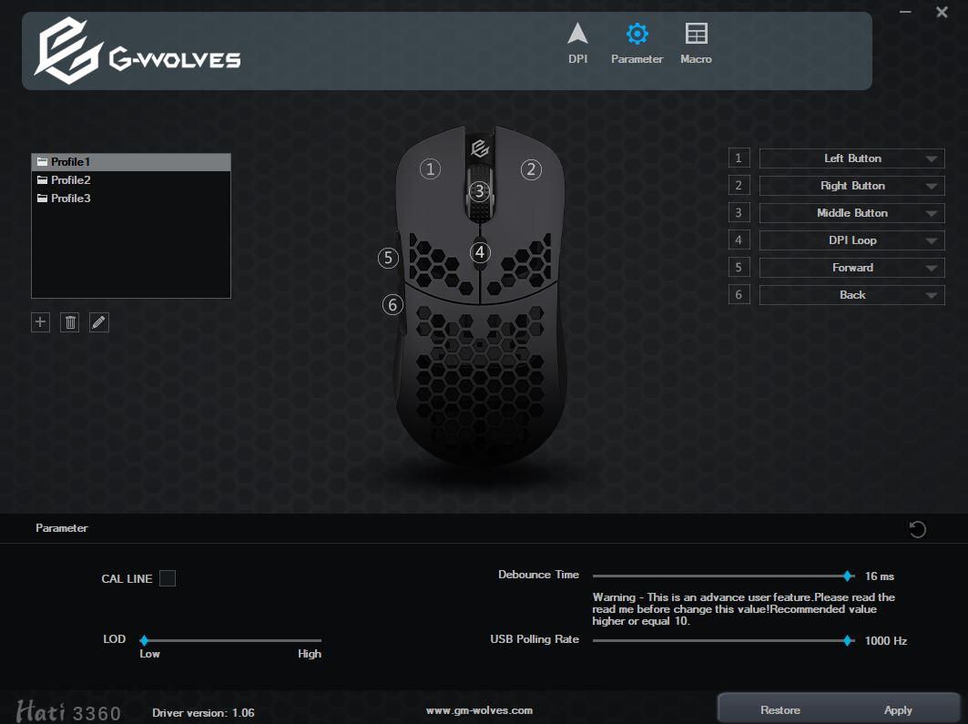 Az egér nyers paramétereit is testreszabhatjuk a saját szájízünk szerint. Ami viszont üdítő változás, hogy a gyártó gyakorlatilag mindent a kezünkbe ad, így a LOD-on és a Polling Rate-en túl a Debounce Time-ot is állíthatjuk, amivel elvileg további milliszekundumokat nyerhetünk, mármint válaszidő terén. Őszintén én nem igazán éreztem különbséget az 1 ms és a 16 ms között, persze ez nem jelenti azt, hogy nincs is.