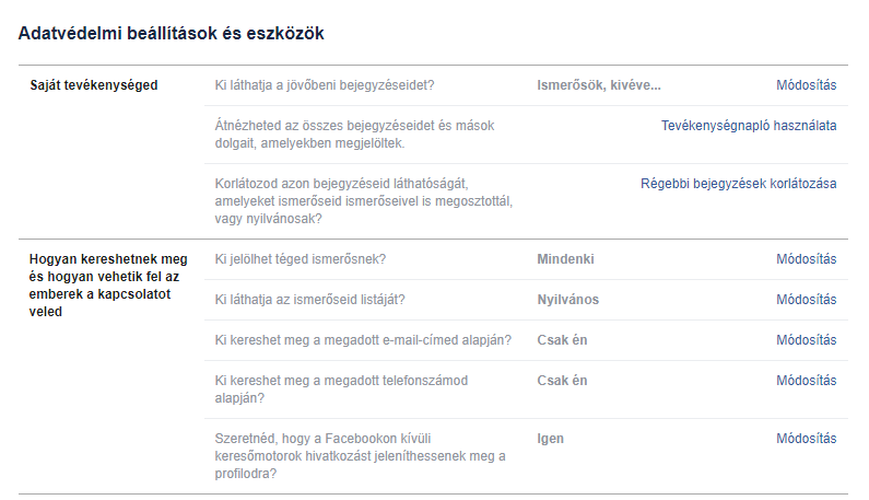Kép a facebook adatvédelmi beállításairól