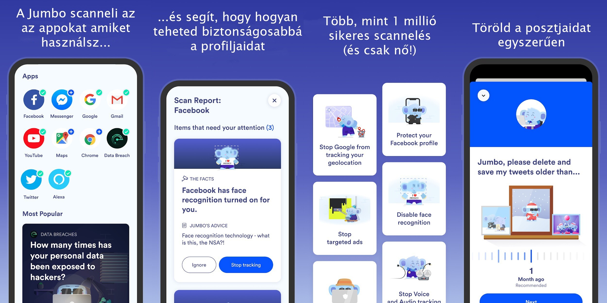 A bejelentkezés után azonnal elkezdenek megjelenni a kis buborékok, melyek jó tanácsokkal és funkciókkal látnak el minket, amivel nem csak biztonságosabbá tehetjük az online adatvédelmünket, de könnyen formálhatjuk is azt, hogy mit látnak belőlünk mások. Rendkívül hasznos funkciója a Jumbonak, hogy néhány kattintás után törölhetjük is a meghatározott hónapnál idősebb posztjainkat.