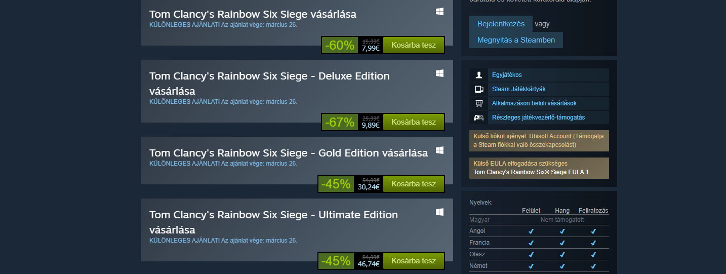 A Steam ugrás valószínűleg annak is köszönhető, hogy most kivételesen nagy kedvezménnyel vásárolható meg a játék a platformon. Az alapjáték jelenleg 60 százalékos kedvezménnyel kapható, 8 euróért, azaz kb. 3 ezer forintért. A Deluxe Edition 67, Gold és Ultimate Edition 45 százalék kedvezménnyel érhető el.