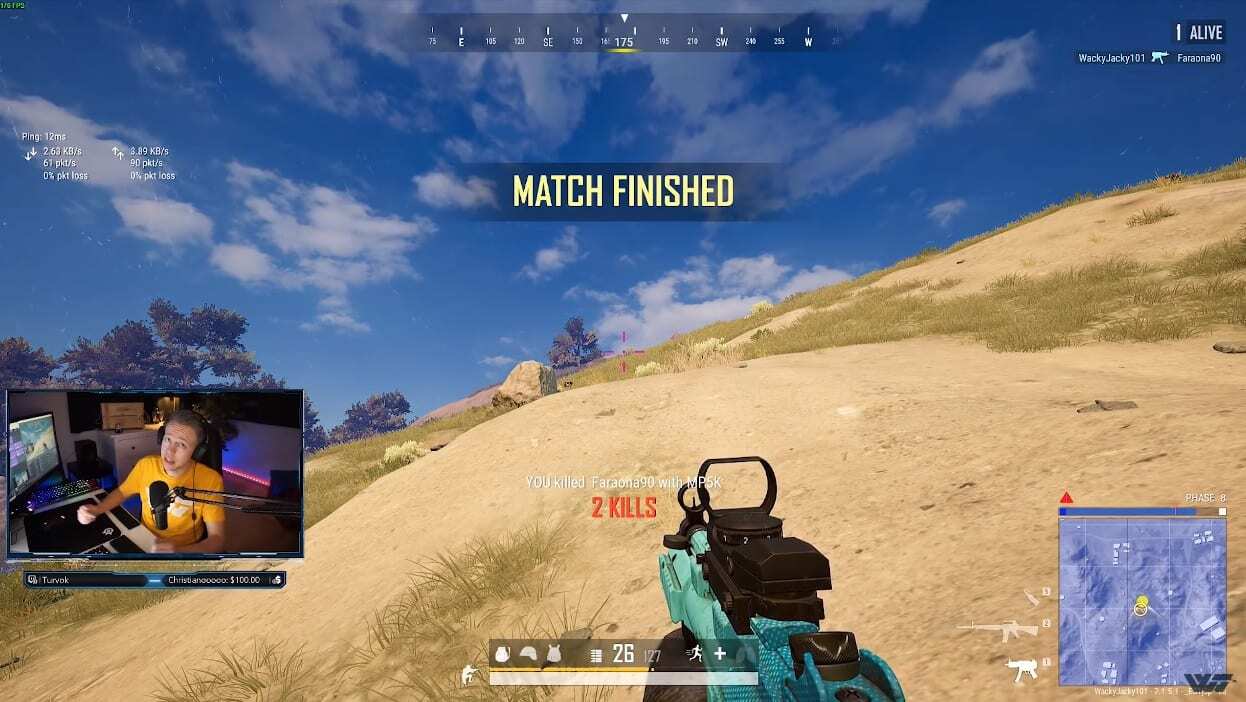 Végül a körön belül, továbbra is rejtőzködve várta a pillanatot, mikor fejezheti be a meccset. Végül az utolsó ellenfelet hátba lőve sikerült behúzni a csirkevacsit, összesen 2 killt termelve az egész meccsen.