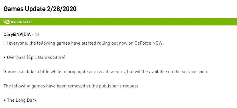 Ahogy a Twitteren olvasható, a fejlesztő Hinterland Studio maga fedezte fel, hogy a The Long Dark ott van a listán. Azonnal kérték annak eltávolítását. A Hinterland stúdió ezután elnézést kért a csalódott rajongóktól, hozzátéve, hogy az Nvidia már elnézést kért az ügy miatt, majd kérvényezte, hogy a játék visszakerüljön a szolgáltatásba. A Hinterland Studio vezetője azonban ezt visszautasította.