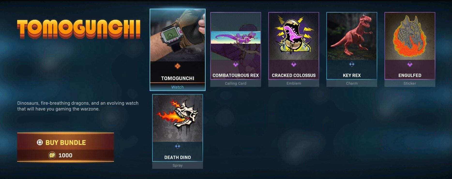 A tomoguchi egy kiegészítő csomagban érhető el, mely az állatka mellett több dinoszaurusz témájú itemet tartalmaz. A csomag 1000 CoD pontba kerül.