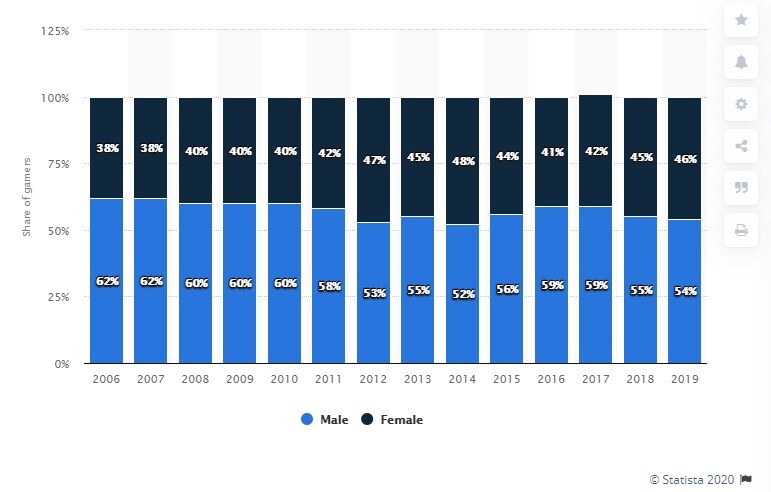 Több kutatás is igazolja, hogy manapság már szinte teljesen 50-50 a gamerek nemi eloszlása. A Newzoo kutatása szerint 2019-ben már a világ gamereinek 46%-a volt nő. Ezt támasztja alá a Statista.com mérése is, ahol már a fejlődés mértéke is látszik. 2017-ben még 42%, 2019-ben már az említett 46% volt a nők aránya. Ilyen ütemű növekedéssel hamar meglesz a tényleges 50-50.
