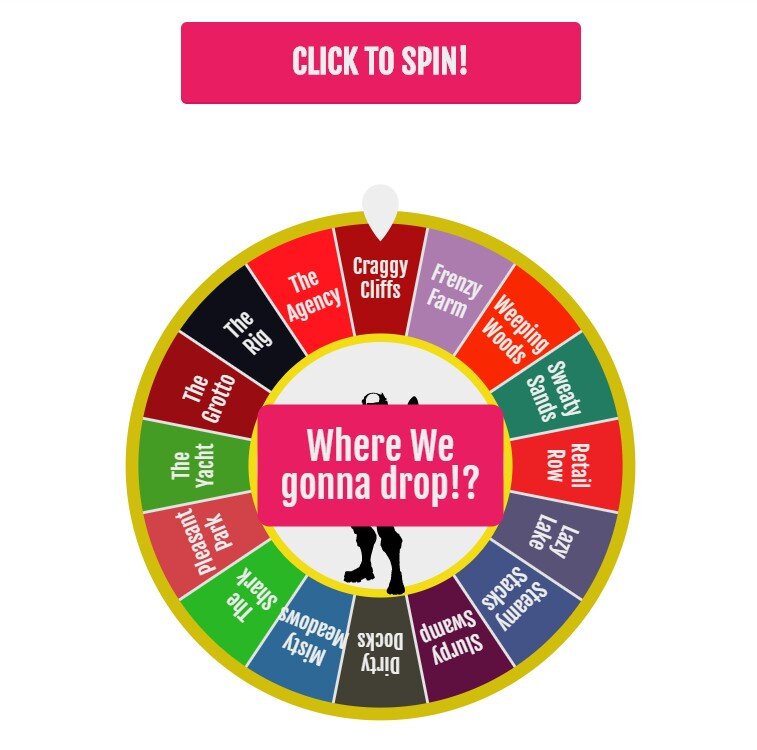 A keréken megtalálható a Fortnite Chapter 2 – Season 2 összes komolyabb landolási helyszíne. A pörgetés után kapunk egy eredményt, ami a következő körünk landolási irányát fogja nekünk meghatározni.