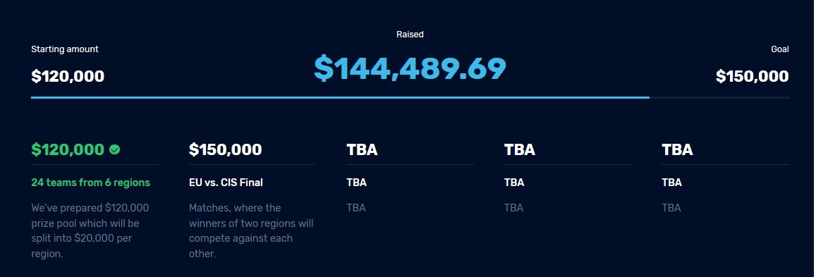 Ráadásul a műsor nézésével is támogatjátok a nemes célt, mivel ezzel a Twitch.tv platformon bit-eket gyűjthettek, aminek felhasználásával szintén hozzájárultok a végösszeghez. Jelenleg 145 ezer dollárnál tartanak az adományok, ami felfedte a következő mérföldkövet. Ha még ötezer dollár összegyűlik a régiógyőztes csapatok egymás ellen is kiállnak, ezzel meghosszabbítva az eseményt.