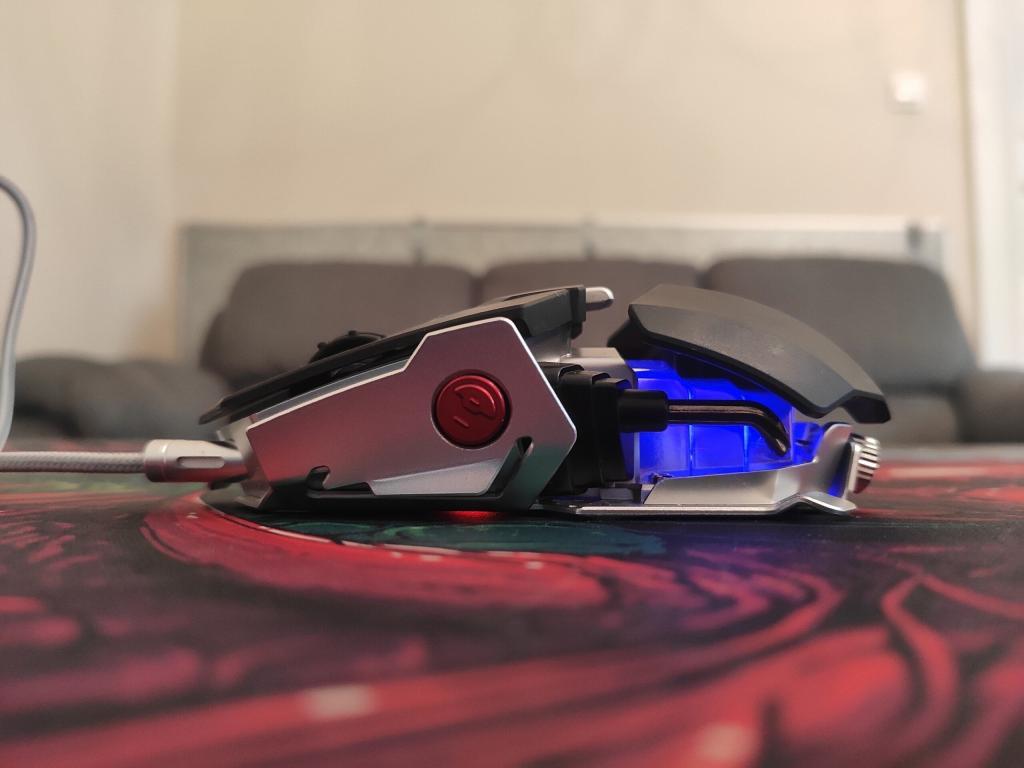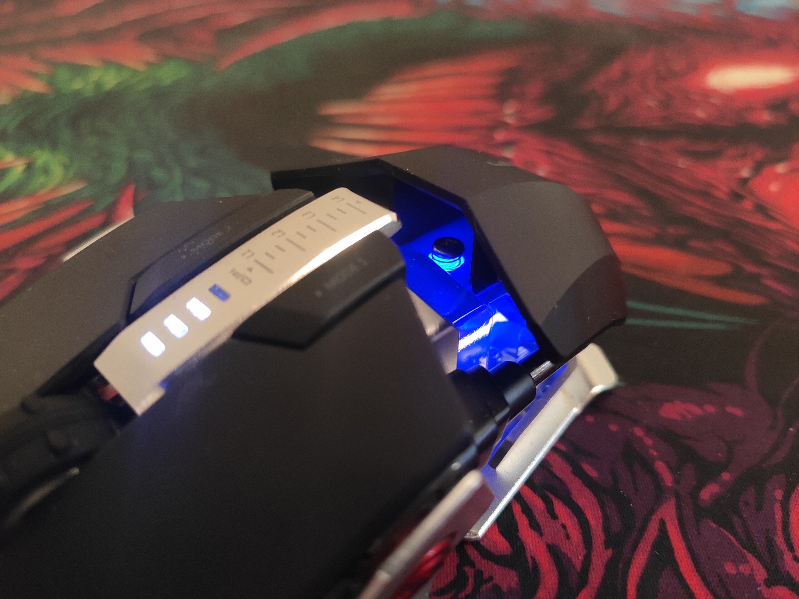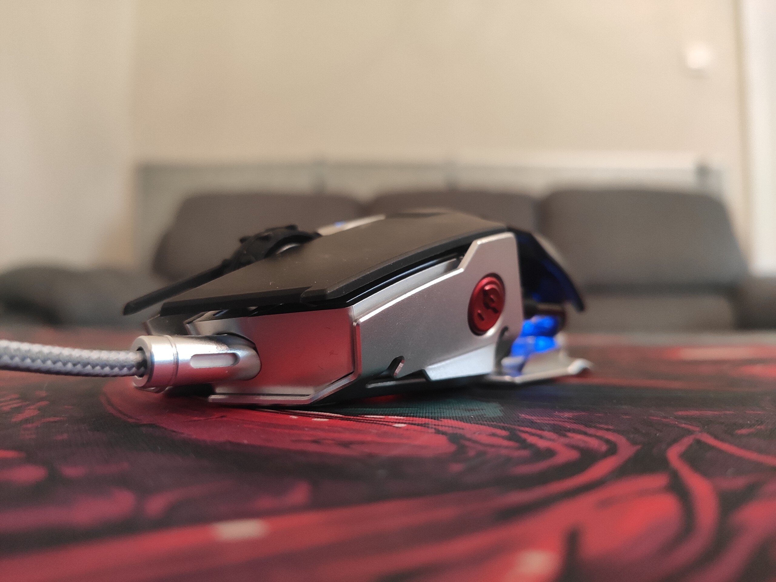 Az oldalán egy nagy piros gomb kapott helyet, ami a „Sniper” gombként ismeretes, a gyakorlatban annyit tesz, hogy amíg ezt lenyomva tartjuk, addig a kurzor alacsonyabb DPI mellett üzemel. Ez főként akkor jöhet jól, ha precízebb mozgásra vágyunk. Amint pedig elengedjük a gombot, a DPI visszaáll a jól megszokott beállításra.