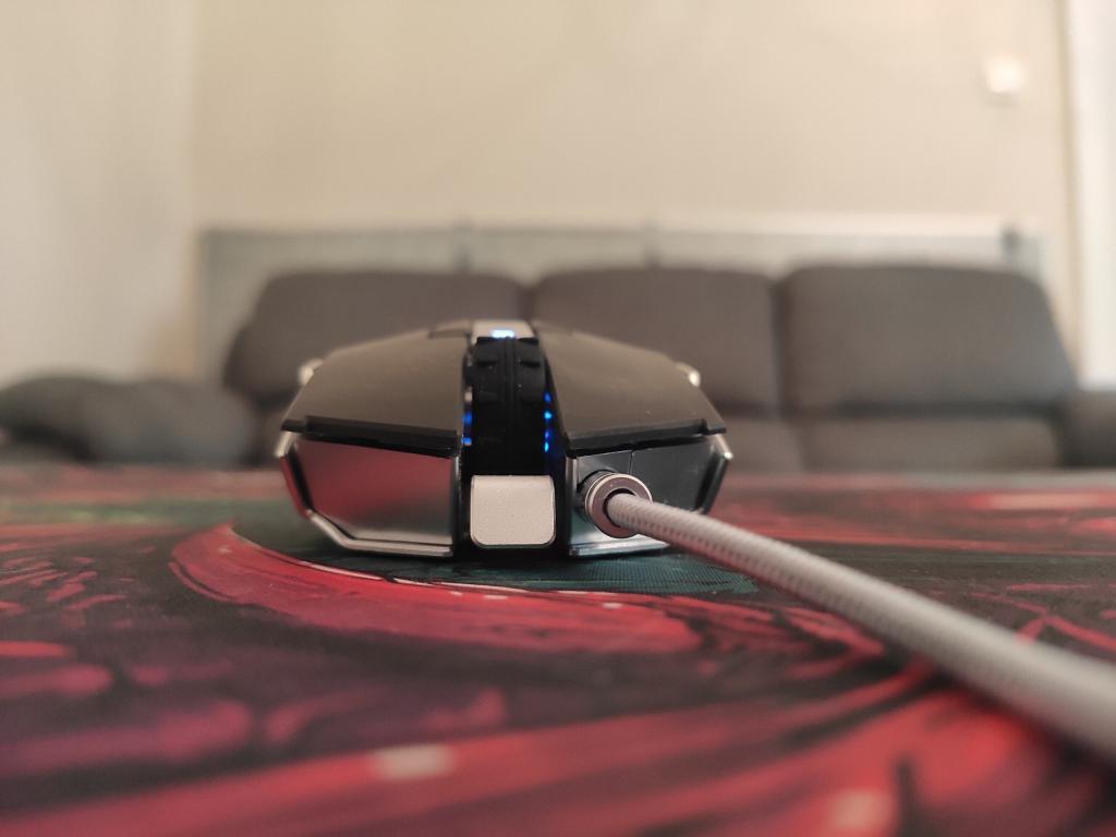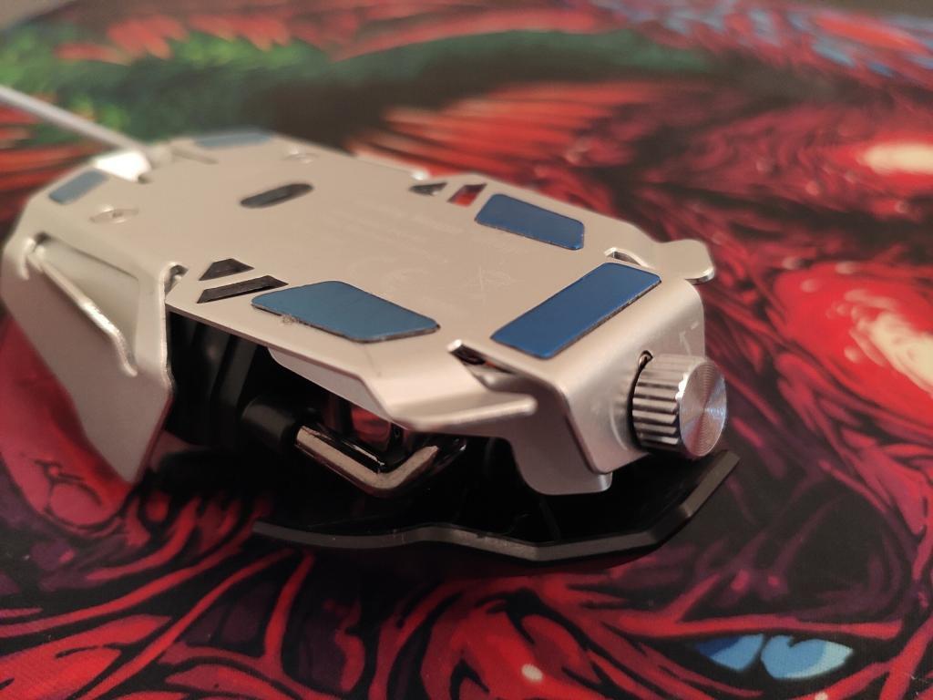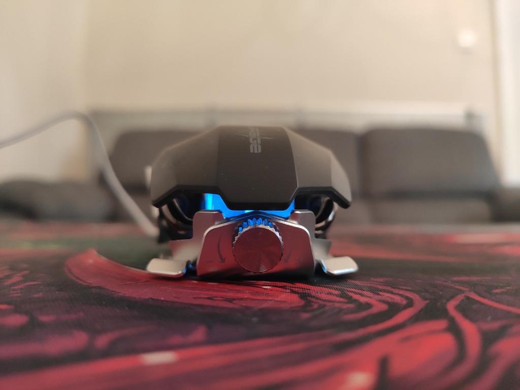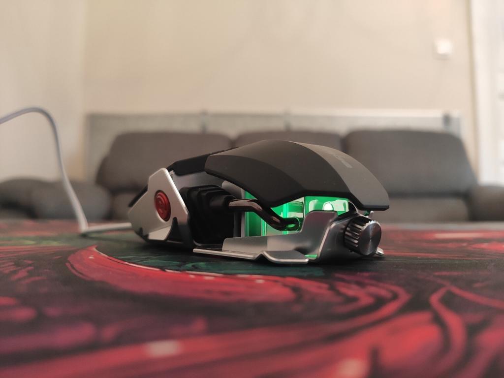 Az oldalán egy nagy piros gomb kapott helyet, ami a „Sniper” gombként ismeretes, a gyakorlatban annyit tesz, hogy amíg ezt lenyomva tartjuk, addig a kurzor alacsonyabb DPI mellett üzemel. Ez főként akkor jöhet jól, ha precízebb mozgásra vágyunk. Amint pedig elengedjük a gombot, a DPI visszaáll a jól megszokott beállításra.