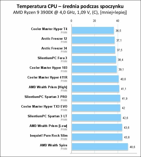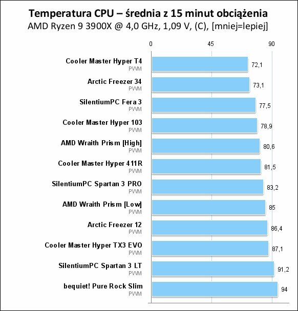 A legjobban a Cooler Master Hyper T4 teljesített, ami terhelés alatt is 72,1 fokon tartotta a 3900X-et, őt követte 1 fokkal lemaradva az Artic Freezer 34, majd a dobogó harmadik helyén a SilentiumPC Fera 3 állt. Ez utóbbi esetén már 77,5 fokos volt a processzor.